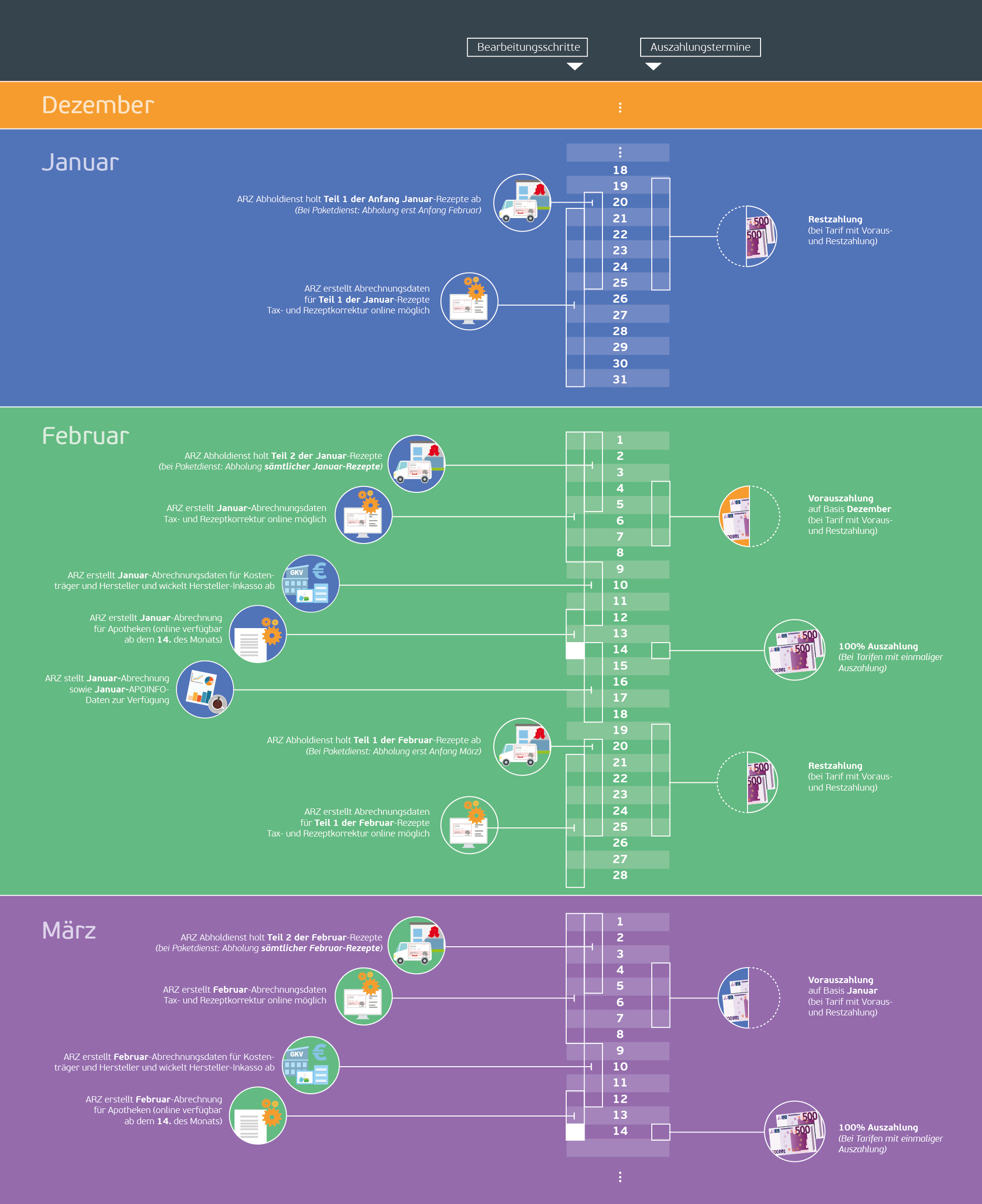 Vielleicht haben Sie sich auch schon einmal gefragt: „Warum basiert meine März-Vorauszahlung nicht auf den Zahlen des Monats Februar, sondern auf denen des Monats Januar?“ Dieses Schaubild erläutert Abläufe im ARZ chronologisch – und zeigt Ihnen die Antwort: Zum Zeitpunkt der März-Vorauszahlung ist die Abrechnung des Monats Februar noch nicht abgeschlossen. Um zeitliche Zusammenhänge bei der Rezeptabrechnung und wichtige Termine zu kennen, möchten wir Ihnen damit einen Überblick über die Prozessschritte im Rechenzentrum geben.